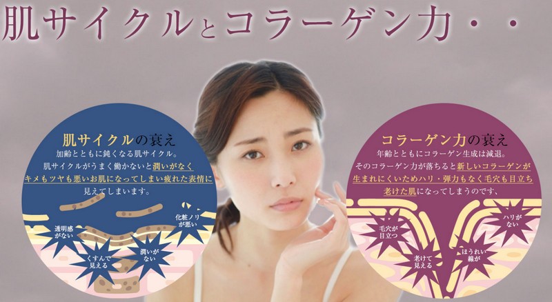 そして、年齢と共にコラーゲンの生成が少なくなり、ハリや弾力がなくなり毛穴が目立ち老けた肌になっていきます。
