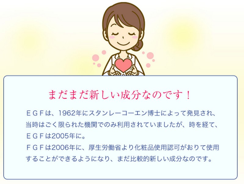 EGFとFGFは新しい成分でEGFは2005年FGFは2006年に、厚生労働省より化粧品への使用認可