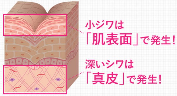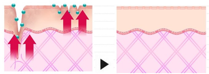 図のようにナイアシンアミドにより高められたコラーゲンが、真皮から押し上げあなたのシワを改善します。