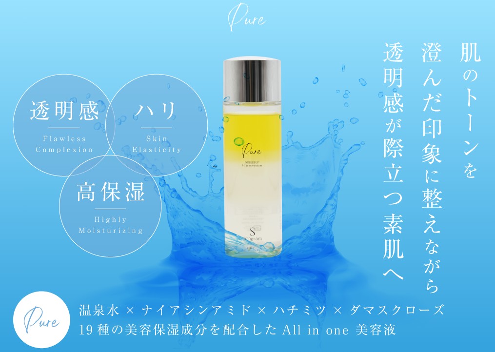 PURE(ピュア)は、肌のうるおい・ハリ・透明感を引き出すために厳選された成分がバランスよく配合されたオールインワン美容液です。