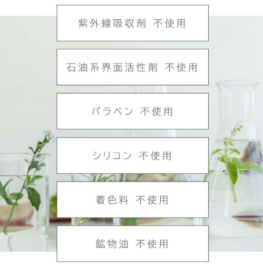 6つの無添加(紫外線吸収剤・シリコン・石油系界面活性剤・着色料・パラベン・鉱物油)